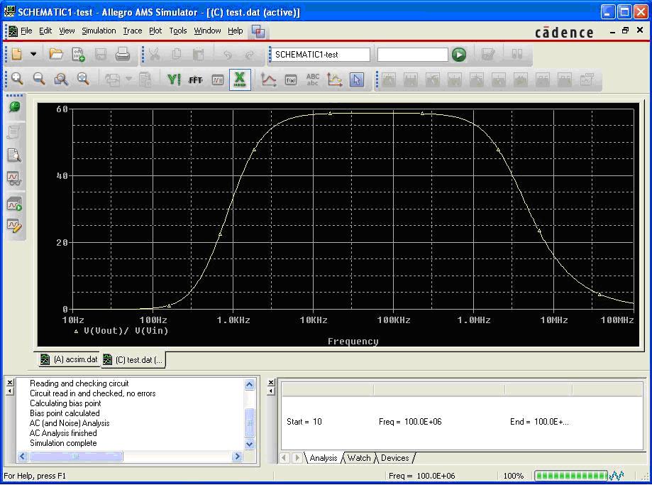 | In the lecture Microelectronics, the students learn the basics of integrated analog circuit design. Step by step, the components of an operational amplifier like current source, differential stage and buffer are covered, resulting in the design of a complete operational amplifier at the end of the lecture (see Bode plot on the right). By means of Cadence Allegro, the students have the possibility to design and analyze those circuits by themselves. In addition, the tool is used to demonstrate circuit behaviour in the lecture. This lets the students get in touch with analog circuit design and thus improves the learning effect compared to just covering the circuit theory | | (click to enlarge the pictures)